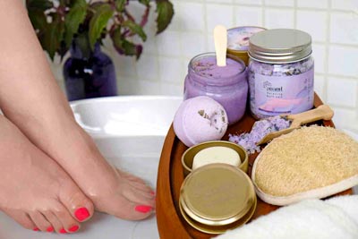 خیساندن پاها: پاها را در آب گرم خیس کنید تا پوست نرم شود و آماده لایه برداری شود.
